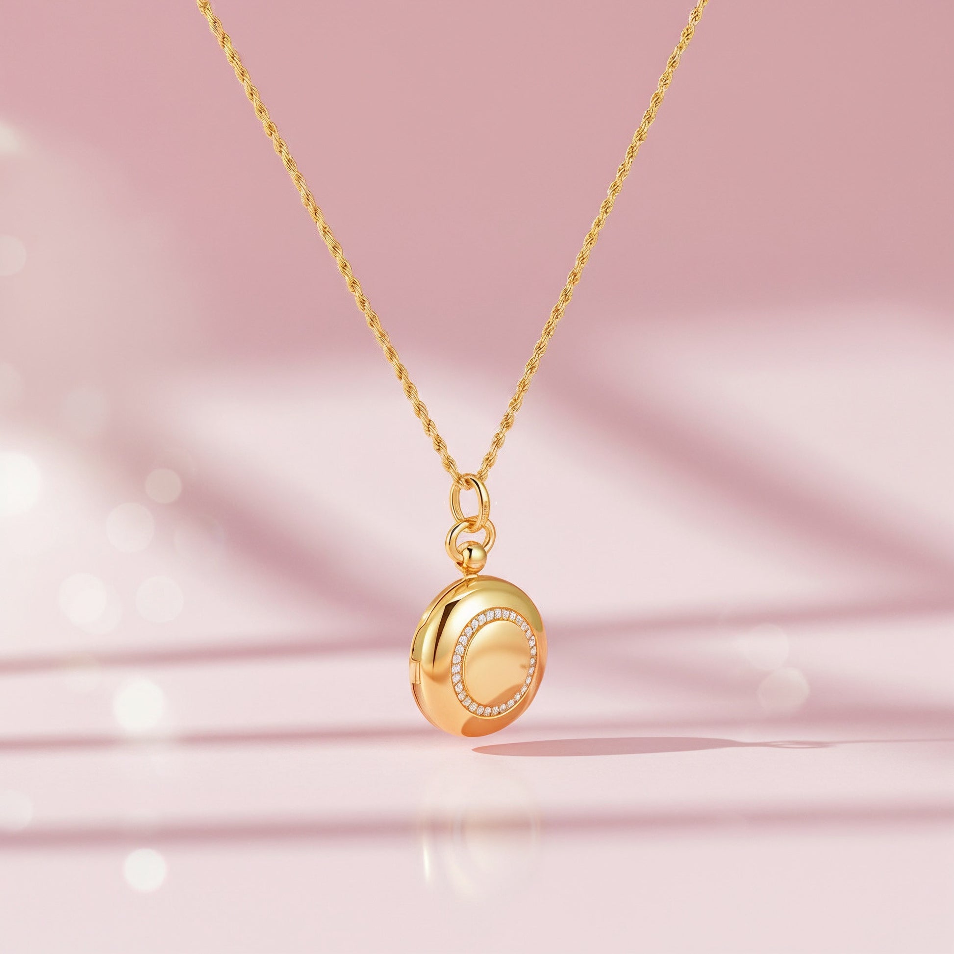 A soft halo of light surrounds this moon-shaped locket, holding your engraved whispers close to your heart — a secret message wrapped in golden serenity.