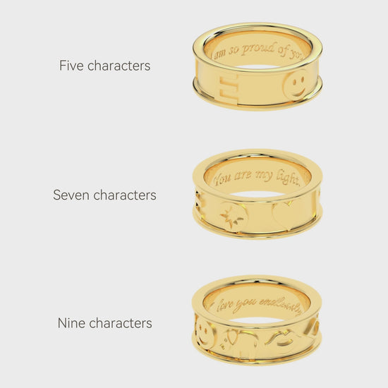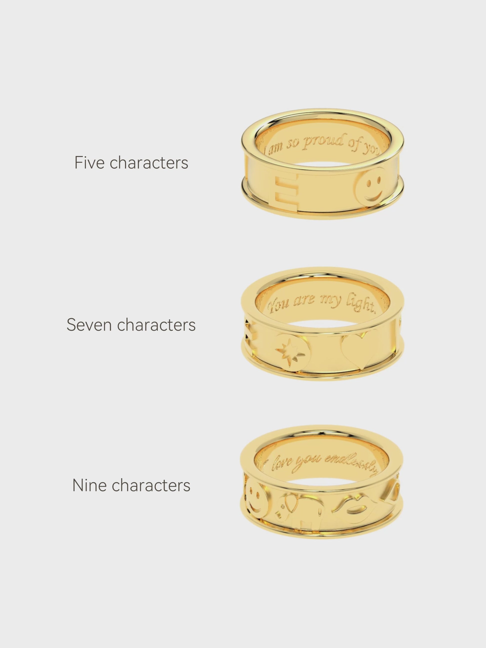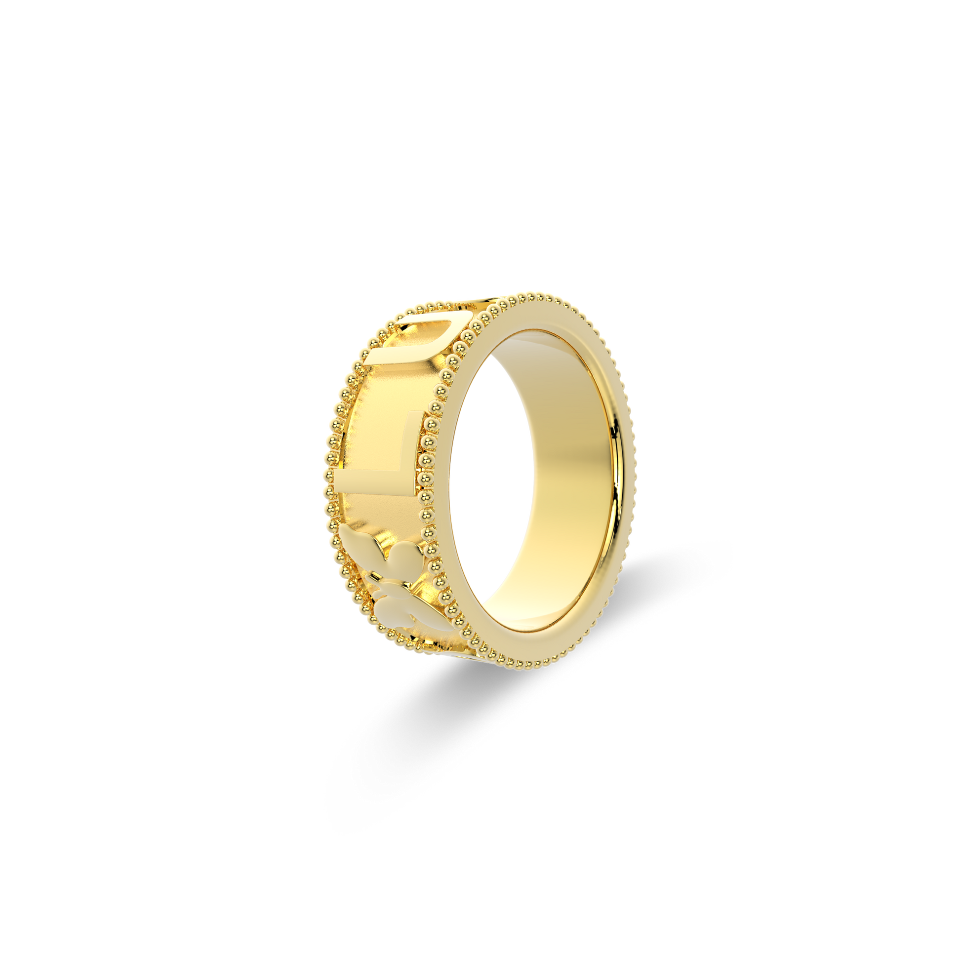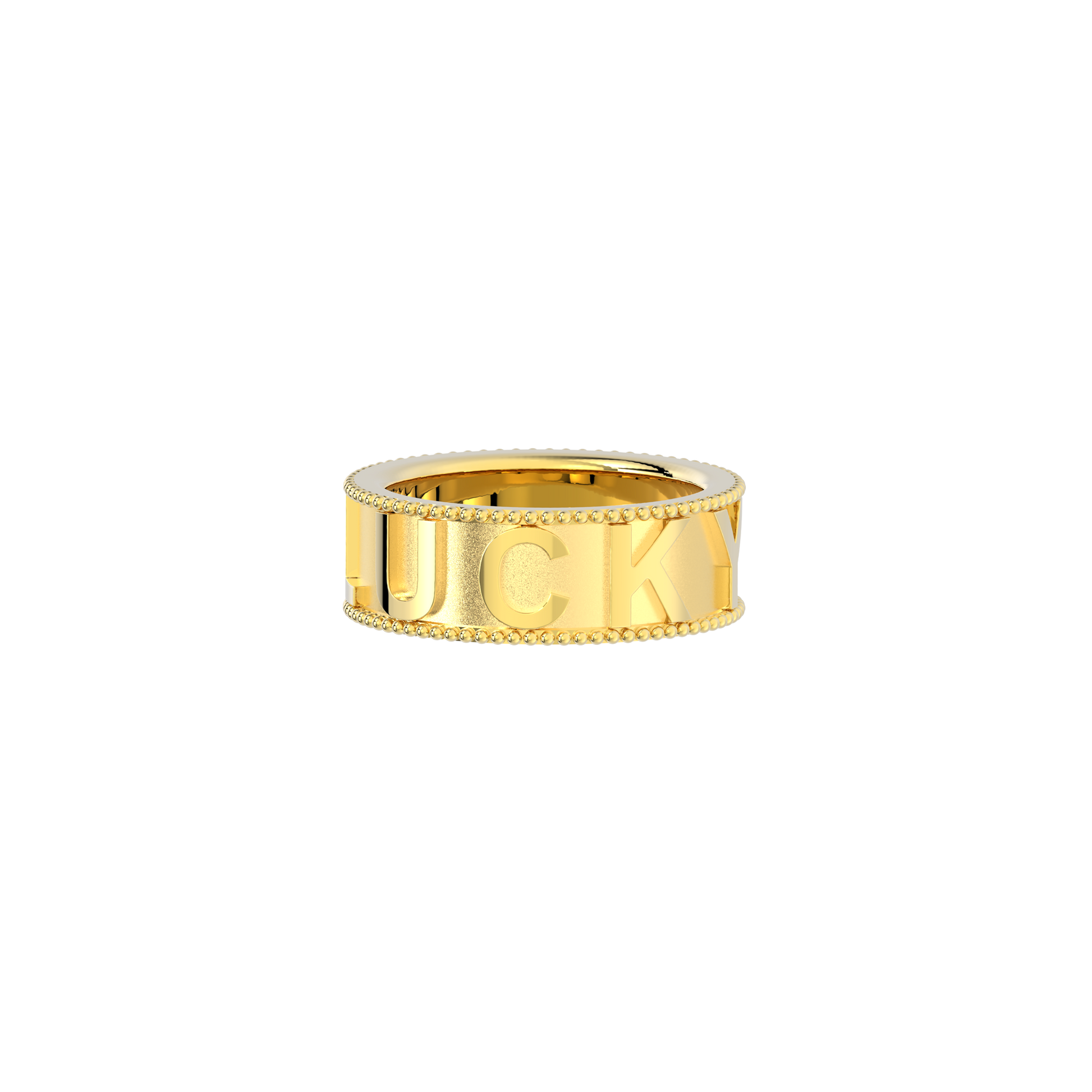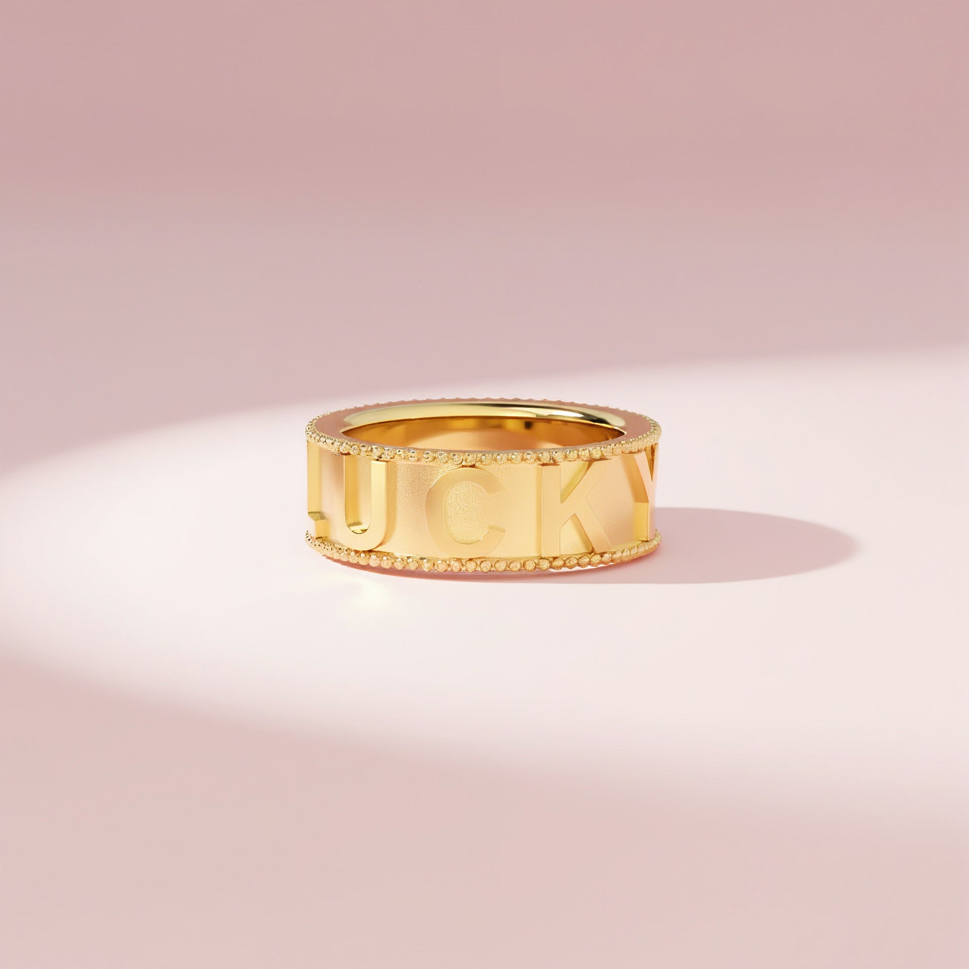 The CharmMark Lucky Ring is a fully customizable band designed to wrap your wishes in gold. Choose from 26 letters, 20 lucky icons, and 9 numbers to spell out a name, a wish, or your own personal charm code. Available in gold or rhodium finish, and crafted in three distinctive styles—classic, pavé, or beaded edge.
